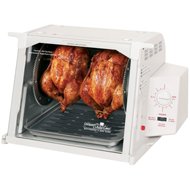Ronco Showtime Rotisseries are the original set it and forget it rotisserie ovens. True to the slogan, this oven features a simple timer dial that is easy to use and ideal for leaving food to cook on its own as the power automatically shuts off when the time is up. This convenient function ensures that your meal is cooked adequately every time and helps to prevent overcooking. The unit's control panel also includes a variety of settings that enhance its slow cooking capabilities including normal rotation, no heat rotation and pause-to-sear options. The Showtime Rotisserie Compact version (ST3001WHGEN) can cook up to a 10 lb turkey and comes with a wealth of accessories designed to make your cooking experience easier. The carving base is handy when it comes to preparing and serving your food and the non-stick rotisserie basket, drip tray, grate cover and spit rods are all dishwasher safe. Also included with each unit are extra food ties, an instructional BBQ cooking DVD, washable rubber gloves and a recipe booklet for healthy meal ideas. Variety of Uses: Use the spit rods for cooking larger items such as turkey or BBQ chicken and the rotisserie basket for hamburgers, vegetables, fish or anything smaller Healthier Cooking: Cooks meats perfectly as it naturally seals in juices and drains off unwanted fat as it cooks. On average, the rotisserie removes about 1/4 a cup of fat per every 4 lbs of meat Easy Cleaning: The glass door and non-stick parts are all dishwasher safe (including rotisserie basket, drip tray, grate cover, and spit rod assembly)